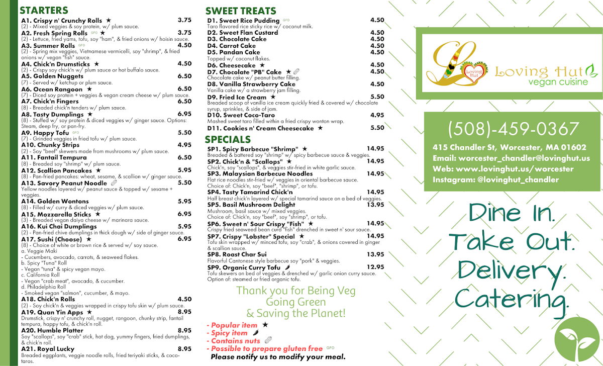 Welcome to Loving Hut Worcester, a haven for vegan cuisine nestled in the heart of Worcester, Massachusetts. Located at 415 Chandler St, this charming eatery has been a beloved spot for locals and foodies alike. With a mission to serve delicious, plant-based meals, Loving Hut has made its mark as a reliable choice for anyone looking to indulge in thoughtful and satisfying dishes.